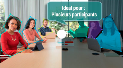 Distingue les personnes des murs et des fenêtres, corrigeant les effets de contre-jour et d’éblouissement pour cadrer confortablement tout le monde pendant la réunion.